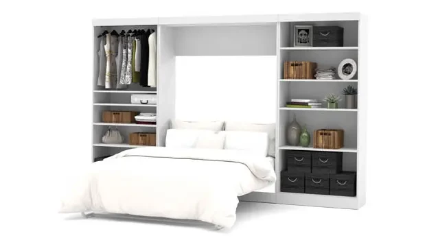 The Bestar Pur Full Murphy Bed with 2 Shelving Units (131" W) is the ideal space saver for a multipurpose room.