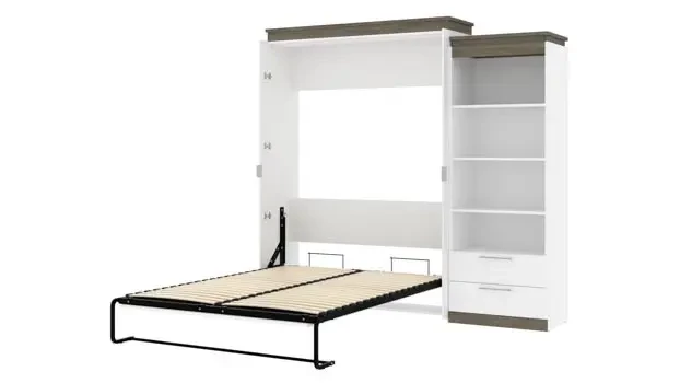 Bestar Office Furniture 94in W Queen Murphy Bed and Shelving Unit with Drawers