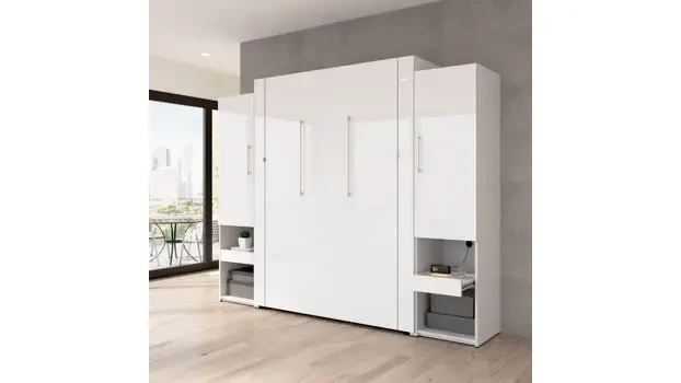 With its scratch resistant, high-gloss finish, sleek pulls, and built-in lighting, the wall bed with storage offers an elegant, contemporary look.